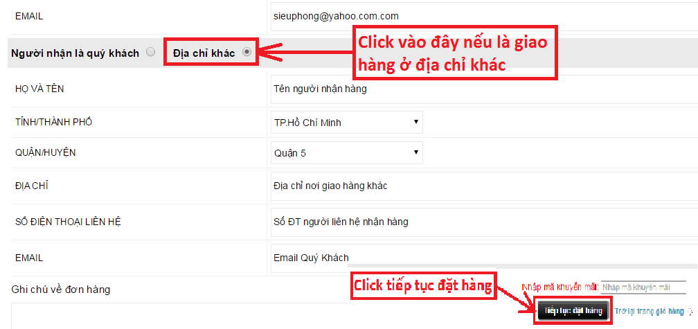 * Trường hợp Quý khách giao tại địa điểm khác, quý khách chọn vào mục "Địa chỉ khác"